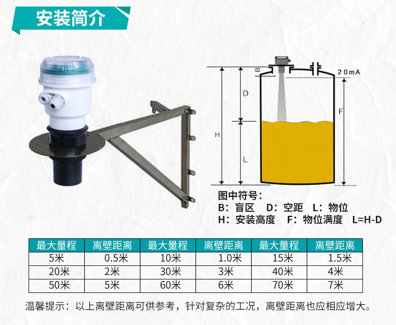 电流输出:4 ~ 20mA 可设定对应物位 / 距离测量范围,最大负载 500 Ω,输出精度 0.2%FS